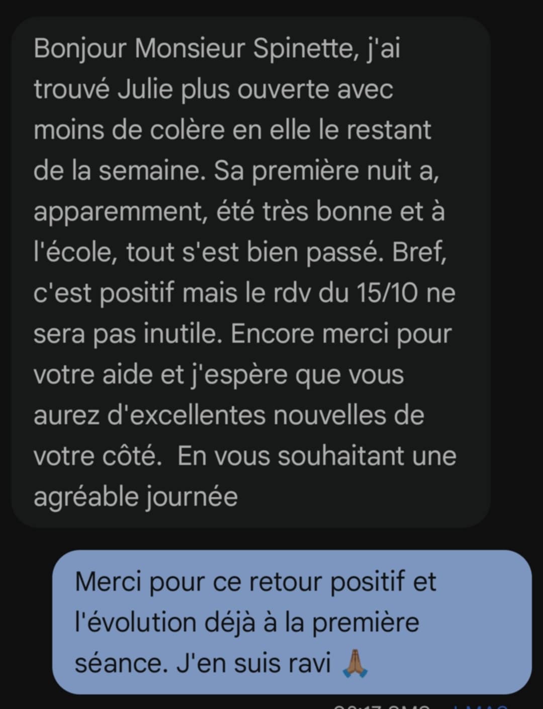 J'ai trouvé Julie plus ouverte avec moins de colère en elle le restant de la semaine. Sa première nuit a apparemment, été très bonne et à l'école tout s'est bien passé. Bref c'est positif mais le rdv du 15/10 ne sera pas inutile. Encore merci pour votre aide .....