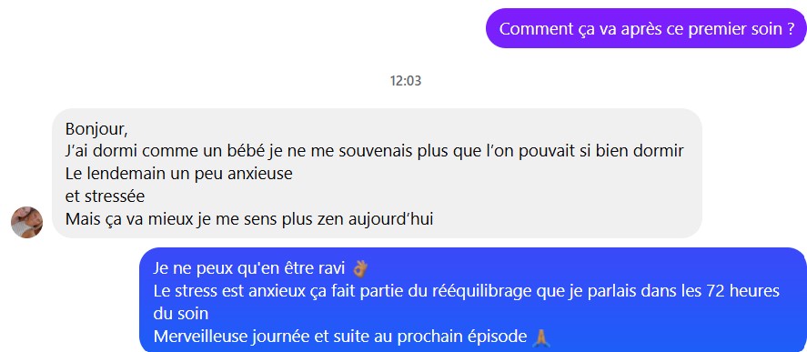 SM : Bonjour Alain ..... Petit feedback de la séance d'hier. J'avais mal à la nuque, suite à votre soin je me sens libérée de cette douleur. J'étais très fatiguée et moins nerveuse. J'ai bien dormi et en réveillant, j'ai eu un peu mal de gorge et puis plus rien......