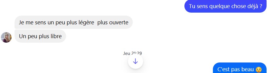 Moi : C'est merveilleux et magnifique, j'en suis heureux pour toi C'est suite à l'hypnose que tu as fait avec moi ?